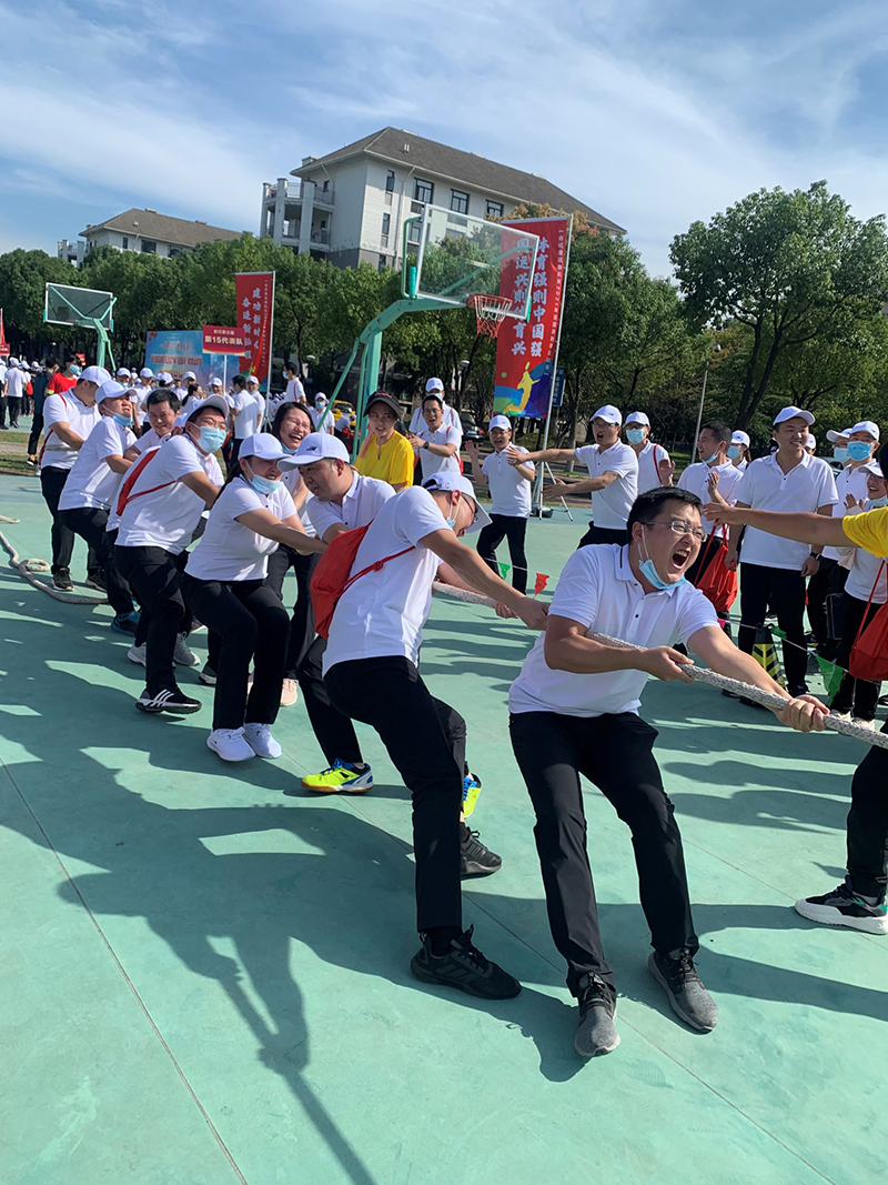 “加油!加油!拉呀,拔呀!”拔河比赛中,参赛者铆足了劲、团结一致往后拉,旁边的啦啦队员们也在使劲地加油鼓掌,震耳欲聋的声音凝聚成了一股力量。