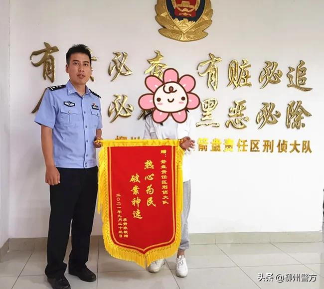 近日, 柳州市公安局鱼峰分局箭盘责任区刑侦大队快速破获一起盗窃案, 抓获犯罪嫌疑人1名,缴获4台笔记本电脑、3台手机,帮助事主李女士成功追回被盗电脑。当事主李女士到派出所领取失而复得的电脑时,将一面印有“热心为民 破案神速”字样锦旗赠予民警表示感谢。