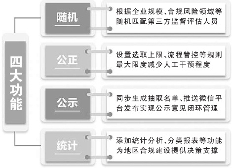 张家港市检察院党组书记、检察长邓根保说:“我们通过第三方监督评估智能管理平台实现分类随机抽取,抽取产生3批次10余名专业人员参与合规监督考察工作,促进实现合规第三方监督评估机制规范、公开、公正运行。”