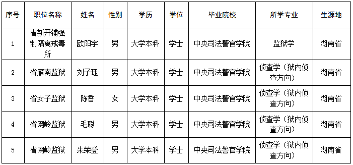 根据《湖南省2021年度面向中央司法警官学院司法行政警察类专业毕业生考试录用公务员工作方案》及有关规定,经报名、资格审查、笔试、面试、选择职位、体能测评、体检、考察等程序,确定欧阳宇等5名同志为湖南省司法厅2021年面向中央司法警官学院考录人民警察拟录用人选,现予以公示。