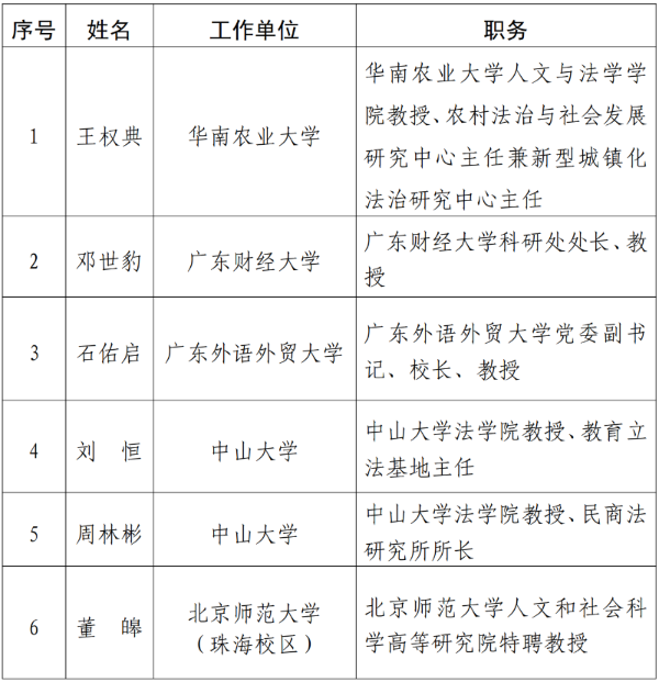 为贯彻落实中央以及省委关于切实加强党政机关法律顾问工作的部署要求,根据《关于推行法律顾问制度和公职律师公司律师制度的意见》(中办发〔2016〕30号)、《关于推行法律顾问制度和公职律师公司律师制度的实施意见》(粤办发〔2017〕3号)、《广东省政府法律顾问工作规定》(省政府令第207号)的规定,结合王权典、邓世豹、石佑启、刘恒、周林彬、董皞6位同志担任省政府第一批专家学者法律顾问的履职情况,拟续聘王权典、邓世豹、石佑启、刘恒、周林彬、董皞6位同志担任省政府第二批专家学者法律顾问。现将拟续聘的6名专家学者法律顾问人选予以公示(详见附件)。