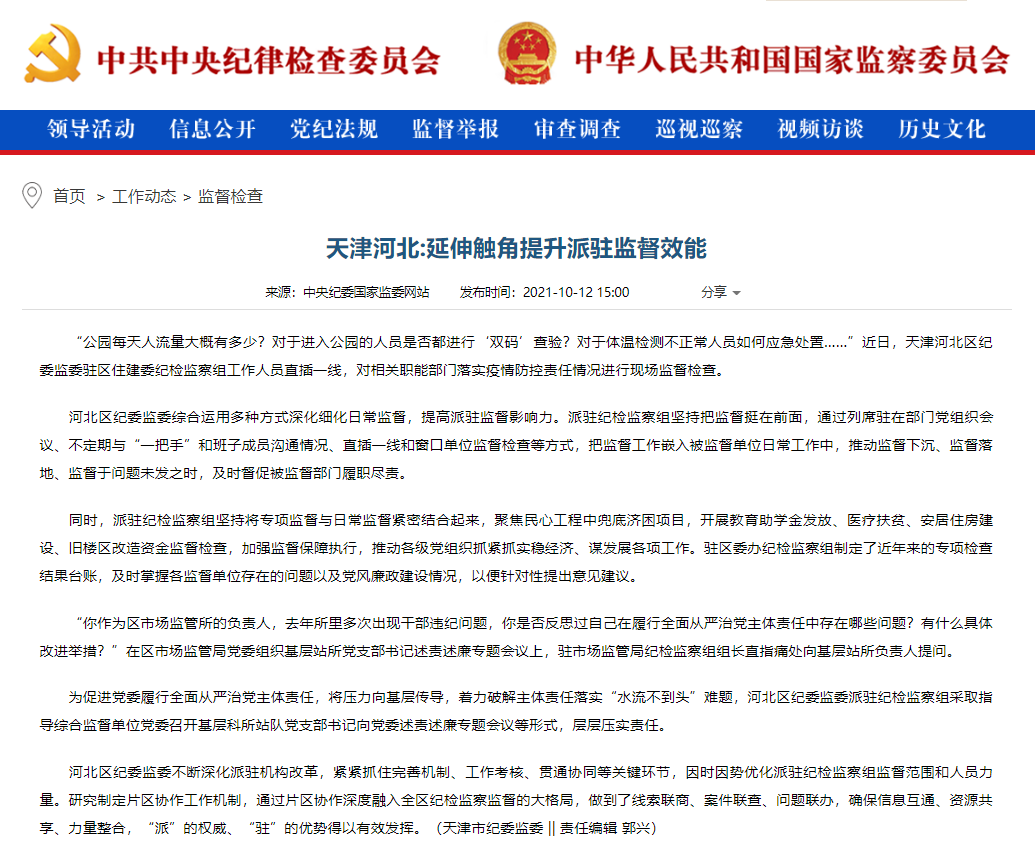 河北区纪委监委不断深化派驻机构改革,紧紧抓住完善机制、工作考核、贯通协同等关键环节,因时因势优化派驻纪检监察组监督范围和人员力量。研究制定片区协作工作机制,通过片区协作深度融入全区纪检监察监督的大格局,做到了线索联商、案件联查、问题联办,确保信息互通、资源共享、力量整合,“派”的权威、“驻”的优势得以有效发挥。