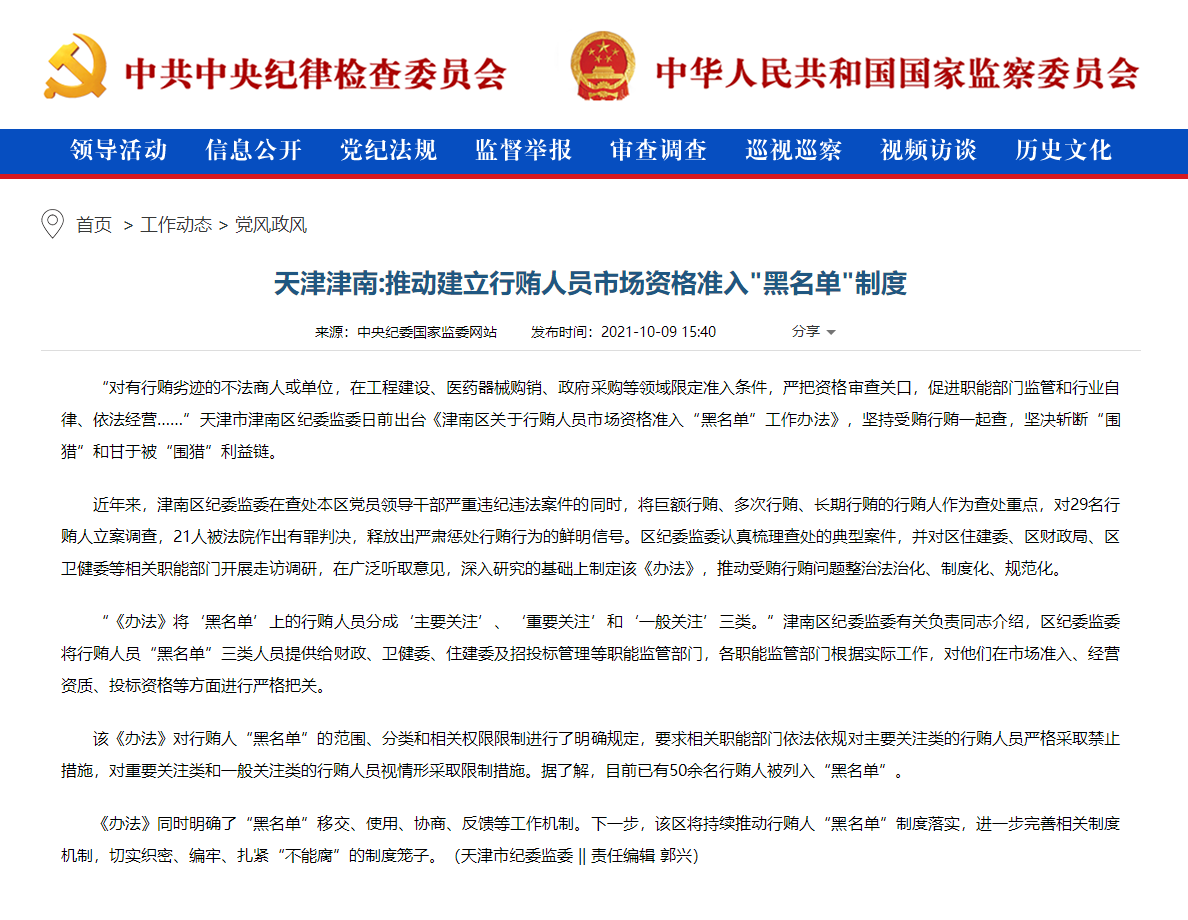 “《办法》将‘黑名单’上的行贿人员分成‘主要关注’、‘重要关注’和‘一般关注’三类。”津南区纪委监委有关负责同志介绍,区纪委监委将行贿人员“黑名单”三类人员提供给财政、卫健委、住建委及招投标管理等职能监管部门,各职能监管部门根据实际工作,对他们在市场准入、经营资质、投标资格等方面进行严格把关。