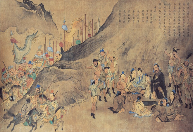 清代焦秉贞作《孔子圣迹图》之《在陈绝粮》。孔门师徒一行在陈国断绝了粮食,跟随的人都饿得爬不起来,孔子却依然讲诵诗书、抚琴歌咏。