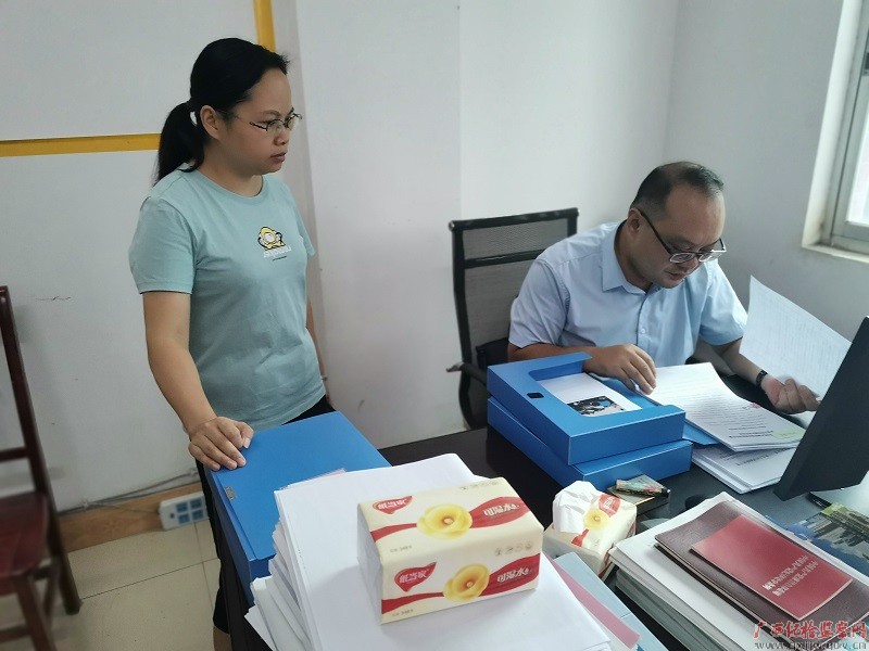 图为该县纪委监委派驻县农业农村局纪检监察组到县农业农村局查阅公务用车加油卡台账材料。(黄恒海/摄)