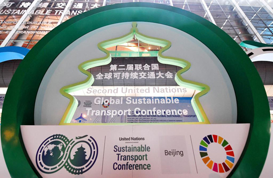 在北京国家会议中心拍摄的第二届联合国全球可持续交通大会标志(10月14日摄)。新华社记者李贺 摄