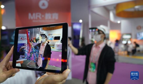 2020年10月19日,2020世界VR产业大会云峰会在江西省南昌市开幕,这是观众在大会VR/AR产品和应用展览会上体验“MR交互系统”在医务教学上的应用。新华社记者 胡晨欢 摄