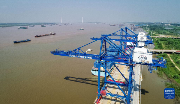 这是8月1日拍摄的阳逻国际港集装箱水铁联运项目码头平台(无人机照片)。新华社发(伍志尊摄)