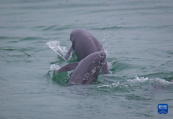 5月10日,在湖北省宜昌市江边,长江江豚在水中嬉戏。新华社记者 肖艺九 摄
