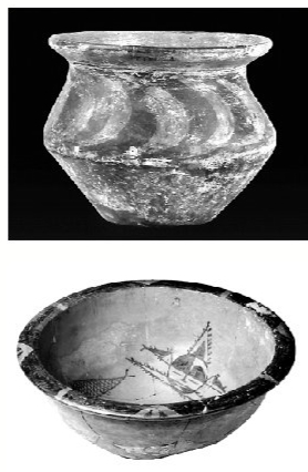 仰韶文化的标志性器物之一是多姿多彩的彩陶。上为仰韶村遗址出土的月牙纹彩陶盆,下为半坡遗址发现的人面鱼纹彩陶盆,表现了仰韶时期人们的审美。(资料图片)