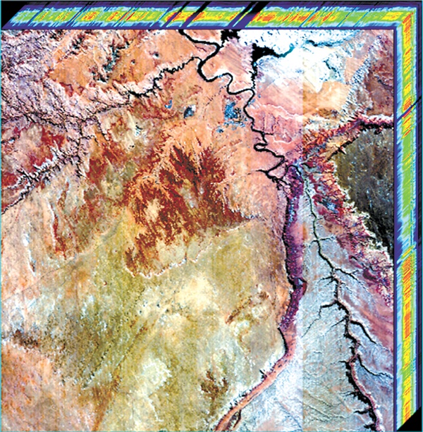 图为高光谱观测卫星在轨测试时获取的可见短波红外高光谱相机数据立方体。该载荷在400—2500纳米范围内有330个光谱通道,这就意味着,针对同一区域,它能同时拍摄330张照片,叠加到一起形成类似的数据立方体。 (生态环境部卫星环境应用中心供图)
