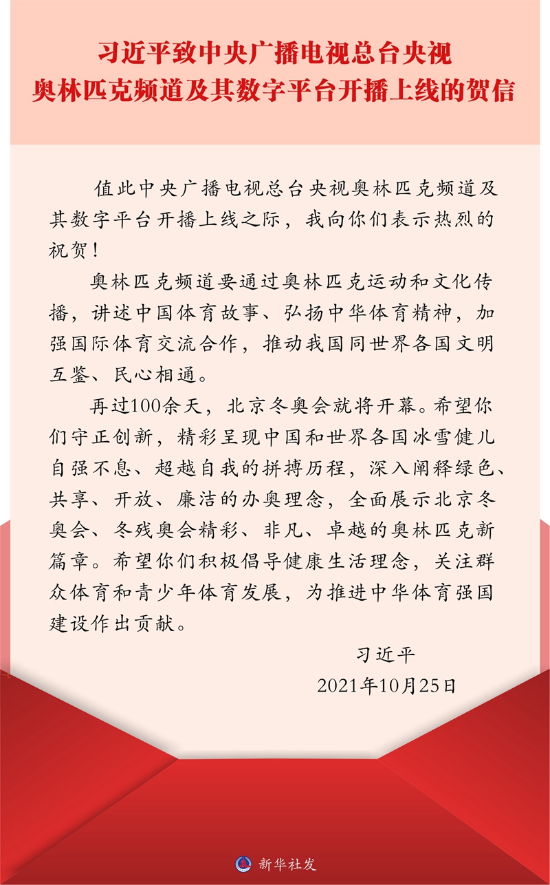 在中央广播电视总台央视奥林匹克频道及其数字平台开播上线之际,中共中央总书记、国家主席、中央军委主席习近平发来贺信,表示热烈的祝贺。