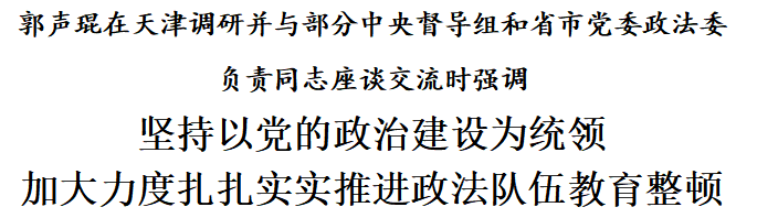 调研期间,郭声琨与中央第一、第二督导组和北京、天津、河北、辽宁党委政法委负责同志座谈交流。郭声琨强调,要旗帜鲜明讲政治,毫不动摇坚持党对政法工作的绝对领导,严守党的政治纪律和政治规矩,严肃党内政治生活,坚决做到“两个维护”。要采取有力措施,坚决清除害群之马,彻底肃清流毒影响,不断净化政治生态。要坚定不移正风肃纪反腐,扎实推动案件线索及时高效办理。要把建章立制与查纠整改一体推进,不断完善制度,坚决执行制度,努力做到抓源治本、常治长效。要更加精准有效进行督导,适时开展“回头看”,进一步压实责任,确保教育整顿走深走实。要坚持统筹兼顾,持续推动教育整顿与安保维稳等重点工作有机结合、互促互进。