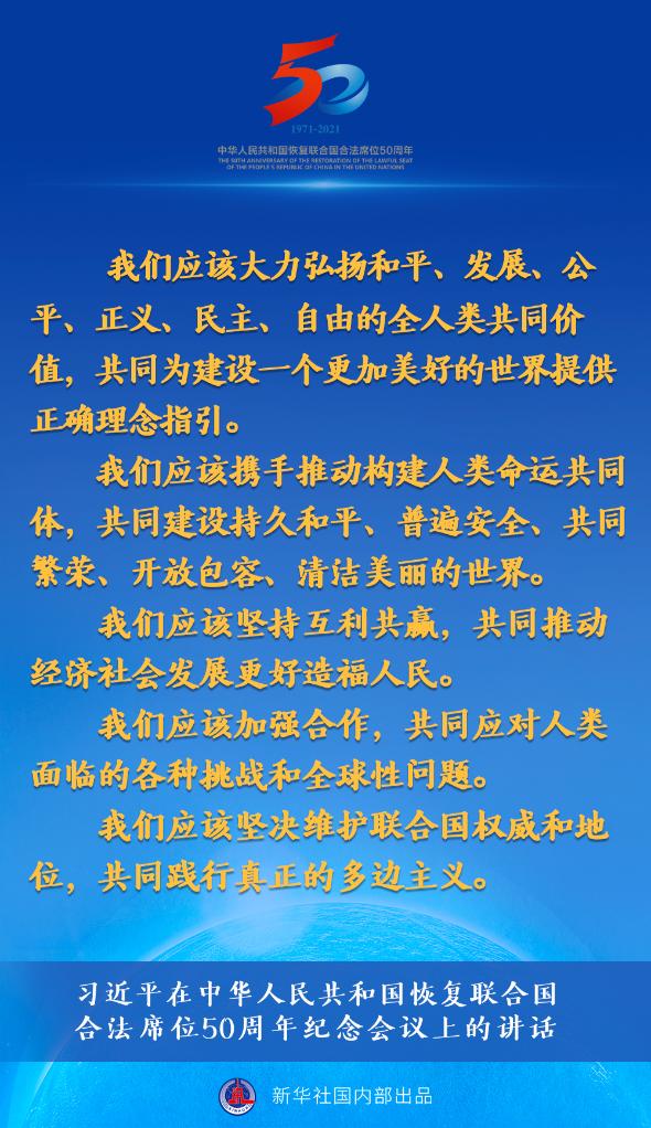 2021年10月25日,国家主席习近平在北京出席中华人民共和国恢复联合国合法席位50周年纪念会议并发表重要讲话。 新华社记者 李响 摄