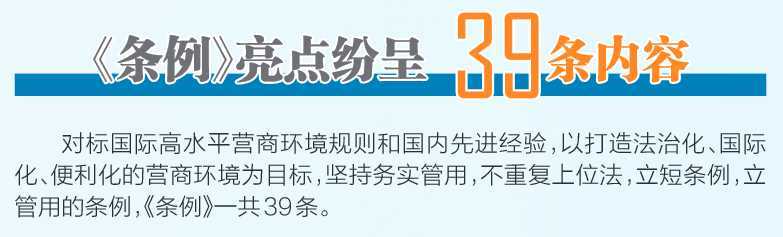 对标国际高水平营商环境规则和国内先进经验,以打造法治化、国际化、便利化的营商环境为目标,坚持务实管用,不重复上位法,立短条例,立管用的条例,《条例》一共39条。