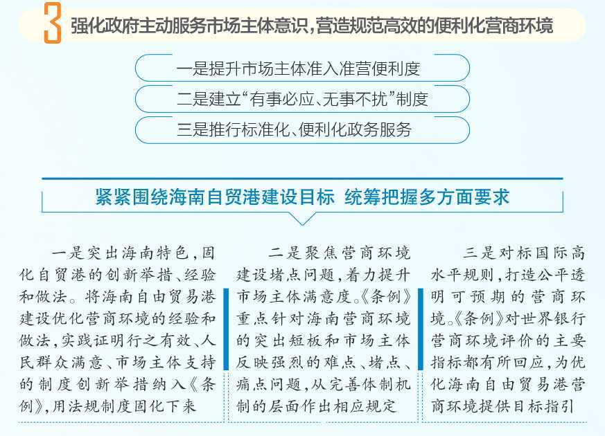 “二是对标国际高水平营商环境规则和国内先进经验,形成引领性的国际化营商环境,包括要求对标国际国内营商环境评价指标体系,制定实施海南自贸港营商环境评价指标体系等,同时《条例》还吸收国内一些地区的先进经验,结合海南自贸港实际,规定了‘承诺即入制’‘拿地即开工’‘水电气联办’‘电子证照’‘差异化监管’‘包容审慎监管’等创新制度。”张相国说,三是强化政府主动服务市场主体意识,营造规范高效的便利化营商环境,涵盖提升市场主体准入准营便利度,建立“有事必应、无事不扰”制度,推行标准化、便利化政务服务等。