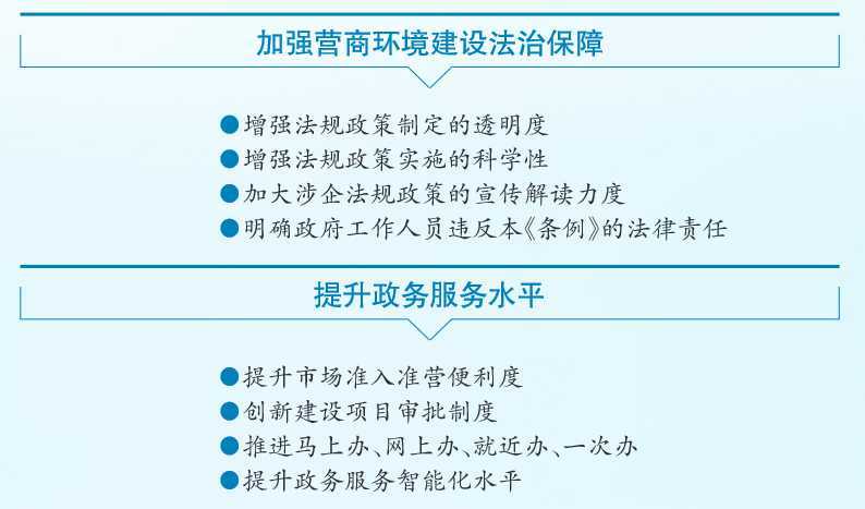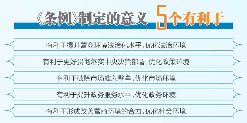 这样一部《条例》,其意义可以用5个“有利于”来概括:有利于提升营商环境法治化水平,优化法治环境;有利于更好贯彻落实中央决策部署,优化政策环境;有利于破除市场准入壁垒,优化市场环境;有利于提升政务服务水平,优化政务环境;有利于形成改善营商环境的合力,优化社会环境。