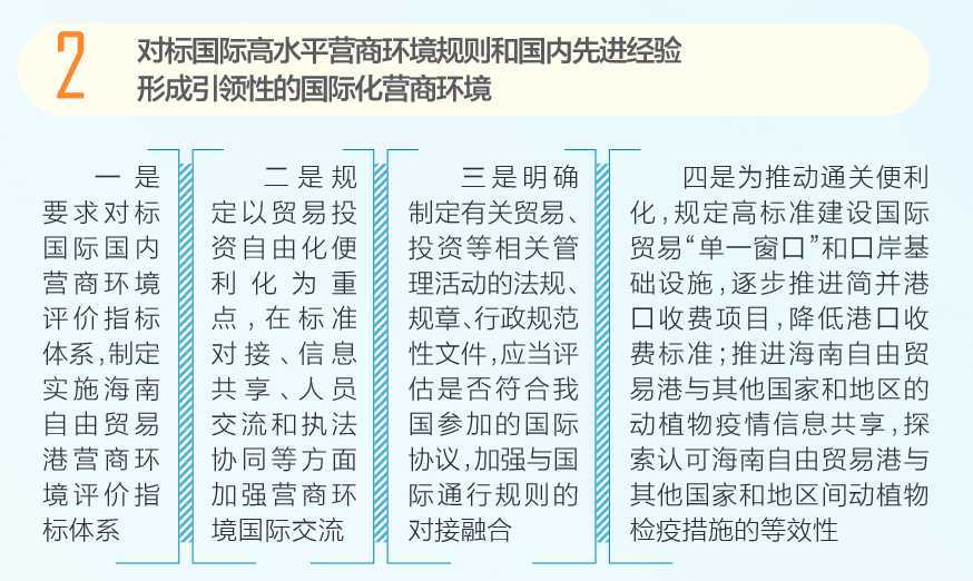 三是对标国际高水平规则,打造公平透明可预期的营商环境。《条例》对世界银行营商环境评价的主要指标都有所回应,为优化海南自由贸易港营商环境提供目标指引
