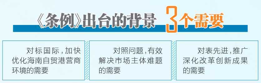“海南自贸港营商环境与建设最高水平开放形态的自由贸易港目标要求相比,与国际先进水平相比仍有很大差距;当前各类市场主体对海南的营商环境还多有诟病,特别是市场要素保障、政府服务水平等方面还存在不少难点、堵点、痛点问题……”张相国说,在国家已经出台相关行政法规的情况下,海南制定《条例》,主要有3个方面的考虑:对标国际,加快优化海南自贸港营商环境的需要;对照问题,有效解决市场主体难题的需要;以及对表先进,推广深化改革创新成果的需要。