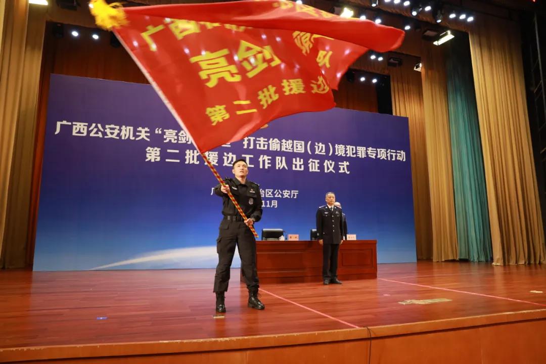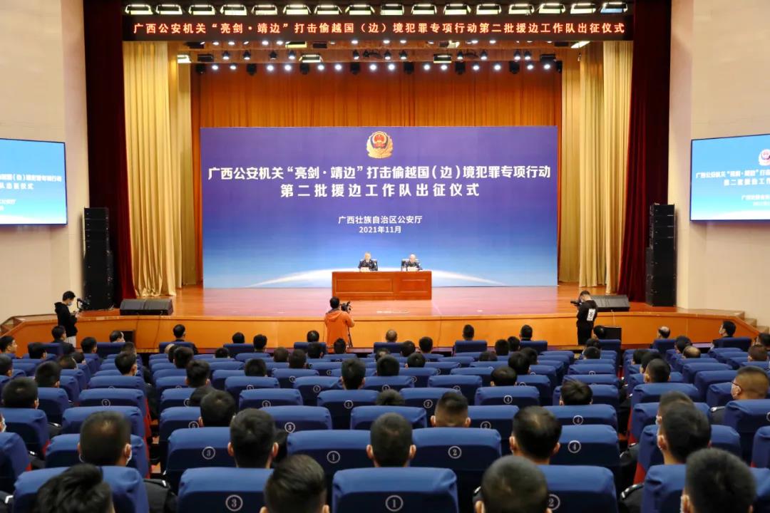 11月4日,广西公安机关“亮剑•靖边”打击偷越国(边)境犯罪专项行动第二批援边工作队出征仪式在自治区公安厅举行。全区11个市502名民警、辅警组成第二批援边工作队即日起奔赴边境一线,对口支援45个边境派出所开展疫情防控和“三非”治理专项工作。
