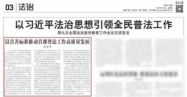 11月4日,《法治日报》以“以习近平法治思想引领全民普法工作”为题,刊登北京市在第九次全国法治宣传教育工作会的交流发言。