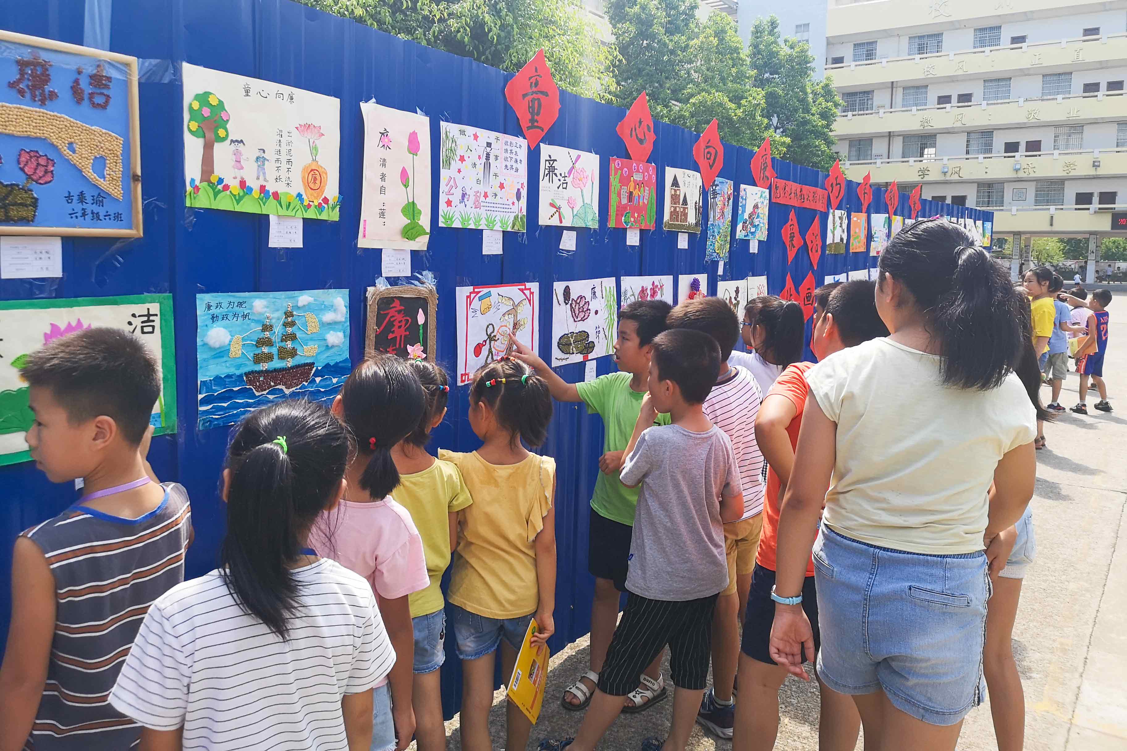 柳州市鹿寨县纪委监委联合县教育局开展廉洁拼贴画进校园活动,让同学们充分发挥自己创作能力绘画廉洁作品。图为鹿寨县城南实验小学师生参观童心向廉 巧手绘廉”作品展。