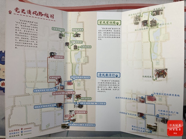 北京市西城区纪委监委发掘西城区红色廉政文化资源,创新制作“红色寻踪旅、清风廉洁行、家风家训路”三条参观路线组成的党史清风路线图,在全区范围内进行发放,宣传引导全区广大党员干部群众接受红色教育、廉洁教育,营造风清气正的良好氛围。图为手绘版的党史清风路线图。(北京市西城区纪委监委 金泽宇 摄)