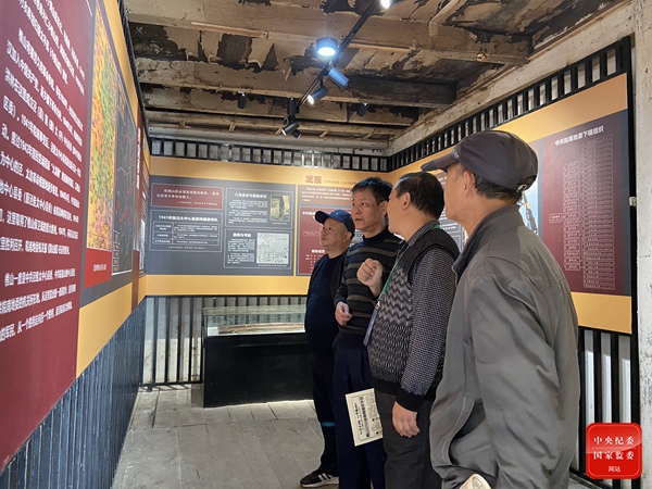 安徽省黄山市黄山区新明乡纪委借助第三届黄山樵山香榧文化旅游节召开之机,积极开展红色廉政文化宣传,打造“红廉一脉 交相辉映”的学教阵地。图为在皖南地委和《黄山报》旧址展览馆内,工作人员向广大游客讲解抗日战争和解放战争时期樵山红色历史和廉政文化。(安徽省黄山市黄山区新明乡纪委供 徐远征 摄)
