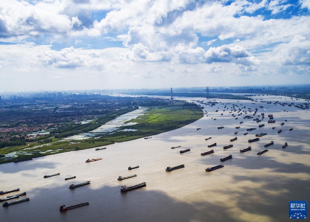 船舶在湖北省武汉市阳逻港区水域行驶(2018年8月13日摄,无人机照片)。新华社记者 肖艺九 摄