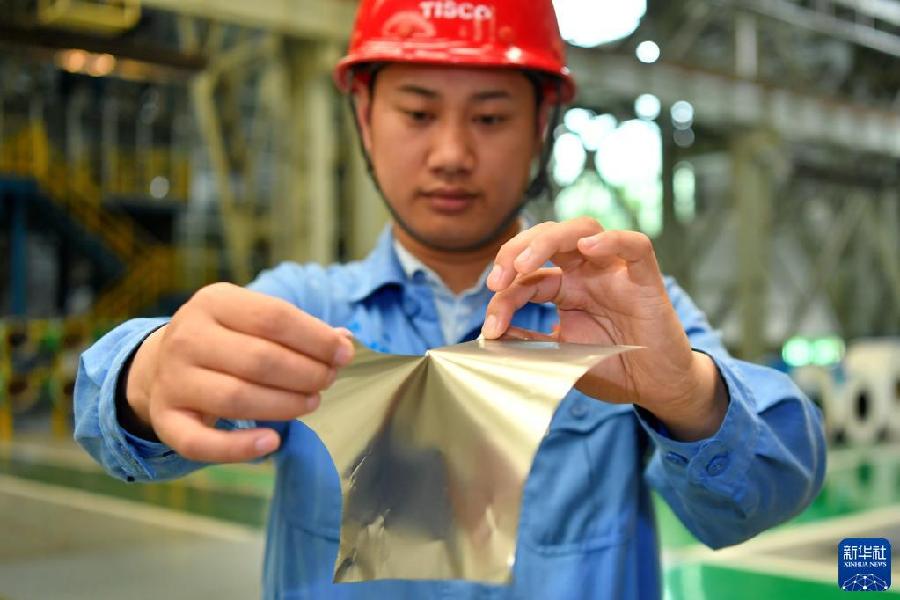在位于山西的太钢集团,员工展示用手撕开0.02毫米厚的超薄带状不锈钢(2019年5月24日摄)。新华社记者 曹阳 摄