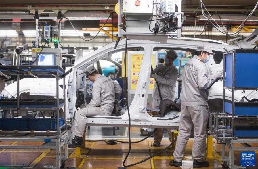 2020年3月24日,工人在湖北武汉东风乘用车公司工厂总装车间的流水线上作业。2020年3月下旬左右,武汉各企业开始陆续复工复产。新华社记者 肖艺九 摄