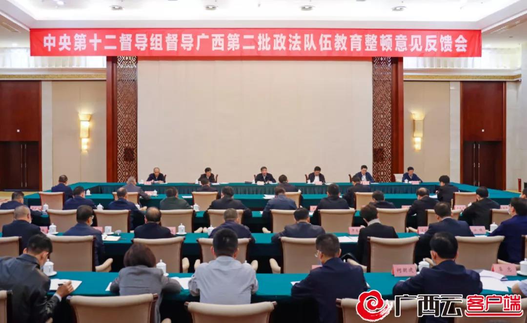 根据中央统一部署,11月15日,全国政法队伍教育整顿中央第十二督导组向广西反馈第二批政法队伍教育整顿督导意见。中央第十二督导组组长苗圩主持反馈会并反馈督导意见,自治区党委书记、自治区政法队伍教育整顿领导小组组长刘宁作表态发言,中央第十二督导组副组长敬大力和督导组成员出席反馈会。