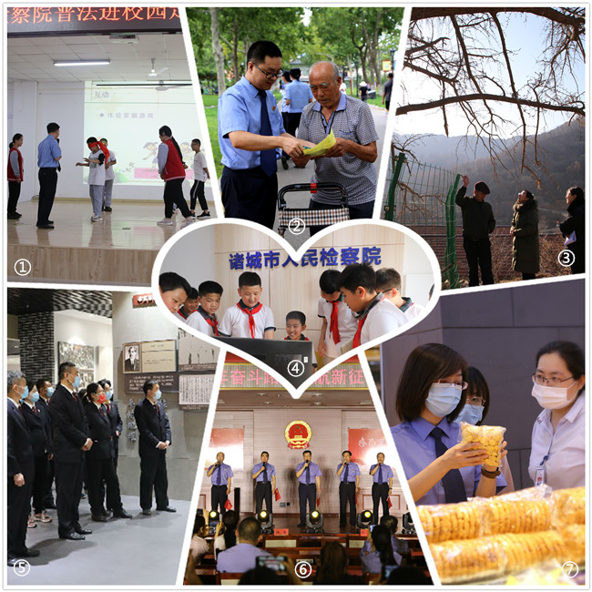 图①:未检检察官和学生们一起表演普法情景剧。图②:街头宣传民法典。图③:检察官与林业部门人员一起查看古树保护情况。图④:检察开放日邀请小学生走进检察院。图⑤:组织干警到尽美干部学院接受革命传统教育。图⑥:“奋斗百年路红歌献给党”主题文艺演出。图⑦:公益诉讼检察官走访超市,调研散装食品包装情况。
