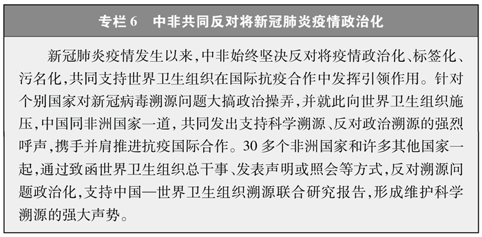 2020年6月,中非团结抗疫特别峰会成功举办。中国成为全球首个同非洲大陆就应对疫情举行峰会的国家,引领国际对非抗疫合作,为全球抗疫合作注入新动力。习近平主席在峰会上阐述了疫情形势下推进中非合作、加强国际合作的重要政策主张,指出要加快落实中非合作论坛北京峰会成果,将合作重点向健康卫生、复工复产、改善民生领域倾斜,并宣布了对非抗疫援助、减缓债和复工复产等系列举措,受到非方高度赞誉和广泛欢迎。与会领导人共同发表了《中非团结抗疫特别峰会联合声明》,一致认为中非双方要坚定不移携手抗击疫情、坚定不移推进中非合作、坚定不移践行多边主义、坚定不移推进中非友好。会后中非双方密切对接,统筹推进疫情防控和复工复产,推动中非合作克服疫情挑战,不断恢复并向前发展。