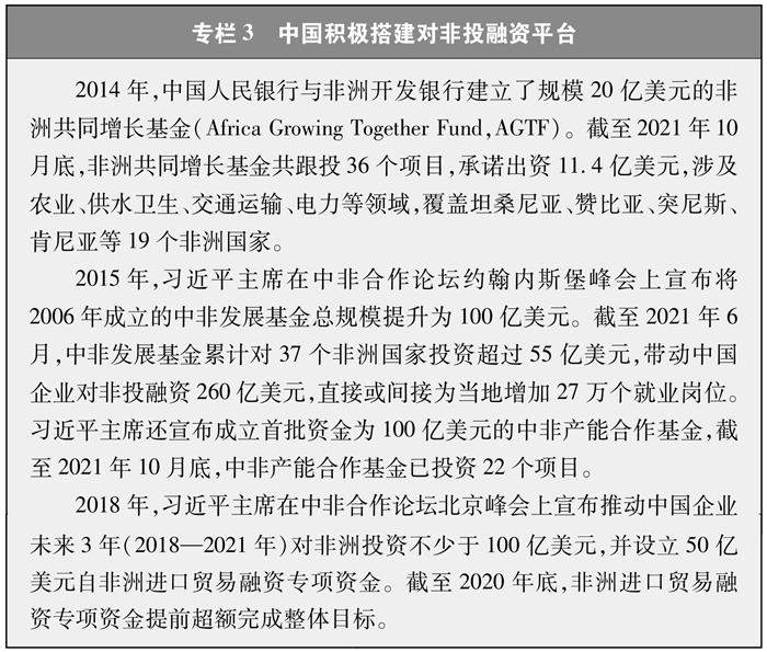 ——加强金融合作。中非金融机构积极开发对方市场,双方央行积极扩大本币结算和互换安排,推动中非金融便利化水平稳步提高。截至2021年10月,人民币跨境支付系统(CIPS)有42家非洲地区间接参与者,覆盖19个非洲国家。中国央行先后与南非、摩洛哥、埃及和尼日利亚央行签署了本币互换协议,金额总计730亿元人民币。中国已同埃及、南非、尼日利亚等7个非洲国家签署了金融监管合作谅解备忘录,为双方金融合作行稳致远打牢基础。中国加入非洲开发银行、东南非贸易与开发银行和西非开发银行等多边开发金融机构。中国已累计向非洲开发银行下的非洲开发基金承诺捐资9.96亿美元。
