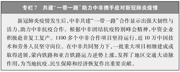 面对突如其来的新冠肺炎疫情,中非双方经受住严峻考验,相互声援、并肩战斗,共同唱响团结合作、共克时艰的时代强音。