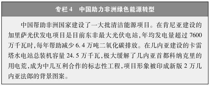 ——助力非洲工业化。工业化是非洲实现包容性和持续性发展的前提,是创造就业、消除贫困、提高生活水平的关键。中国支持非洲国家根据自身国情和发展需求,改善投资软硬环境,以产业对接和产能合作为龙头,助力非洲工业化和经济多元化进程。截至目前,中国与15个非洲国家建立产能合作机制。中国与非洲国家合作建设经贸合作区、经济特区、工业园区、科技园区,吸引中国等各国企业赴非投资,建立生产和加工基地并开展本土化经营,增加当地就业和税收,促进产业升级和技术合作。中非产能合作基金围绕非洲“三网一化”(高速铁路网、高速公路网、区域航空网和工业化)建设战略开发业务,截至2021年3月,累计投资21个项目,涉及能源、资源、制造业等多个领域,有力带动非洲国家产业发展。数十家中资企业与非洲企业合作建设光伏电站,累计装机容量超过1.5吉瓦(GW),填补非洲光伏产业链空白,有效缓解当地用电紧缺问题并促进低碳减排。