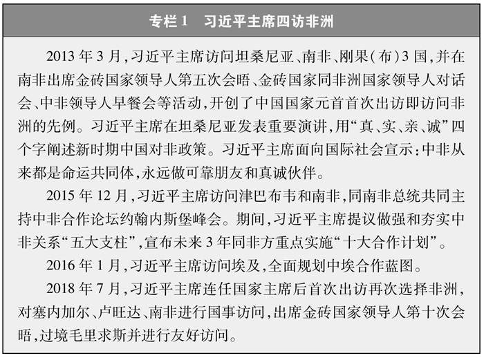 高层交往对中非关系发展发挥着重要引领作用,双方领导人就双边关系和共同关心的重大问题加强沟通协调,为巩固传统友谊、增强政治互信,维护共同利益、共谋发展合作提供了有力政治保障。2013年3月,习近平主席就任国家主席后首次出访就远赴非洲,至今已四次访非,足迹遍及非洲东西南北中。2018年中非合作论坛北京峰会期间,习近平主席同与会的50余位非洲国家领导人逐一会面,叙友情、商合作、话未来,并出席近70场双多边活动。2018年中非合作论坛北京峰会后,17位非洲领导人先后来华访问或出席会议。新冠肺炎疫情发生后,双方领导人通过视频、通话等形式保持交往和沟通。2020年6月,习近平主席以视频形式主持召开中非团结抗疫特别峰会,13位非洲领导人和非盟委员会主席出席。疫情以来,习近平主席先后同非洲各国元首通话17次,保持了中非高层交往的密度和热度。习近平主席对非洲朋友真诚友好、平等相待,与非洲领导人建立深厚的友谊和信任,以元首外交引领了中非关系行稳致远。