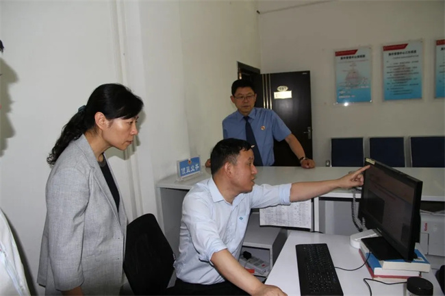 陕西省检察院检委会专职委员丁鹏敏在陕西省榆林市横山区检察院查看检察业务应用2.0系统。