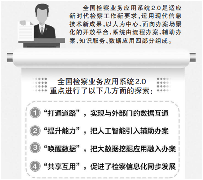 融合全国检察机关“智慧检务”最新成果。“2.0系统”集智慧检务之大成,紧紧围绕“四大检察”“十大业务”,突出以办案人员为中心来设计,在做优原来系统流程办案模块的基础上,创新融合了辅助办案、数据应用等全国各地智慧检务的最新成果。