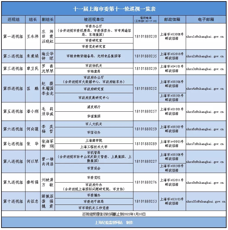 巡视期间设值班电话和专用邮政信箱,主要受理反映被巡视单位领导班子及其成员和下一级主要负责人问题的来电来信,重点是关于违反政治纪律、组织纪律、廉洁纪律、群众纪律、工作纪律和生活纪律等方面的举报和反映。巡视组受理信访时间截止到2022年1月10日。