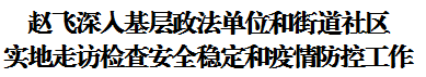 2022年1月1日上午,市委常委、市委政法委书记赵飞先后来到公安河西分局文化中心治安派出所和马场派出所、公安和平分局五大道派出所,河西区越秀路街港云里社区、和平区五大道街友谊里社区,实地检查元旦假期期间值班值守和安全保卫、维护稳定、疫情防控工作落实情况,慰问坚守岗位的公安民警、辅警和社区工作者,并致以节日问候。