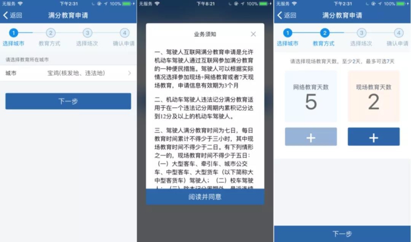 如何学习?满分教育学习采取网络教育+现场教育模式。学习时间为7日,每日教育时间累计不得少于3小时(当日未累积满学时的当天学习时间作废),其中现场教育不得少于2日。第一步选择教育城市和教育方式驾驶人选择现场教育城市并认真阅读满分教育申请业务须知后,进入教育方式选择页面,在该页面,驾驶人需确认现场教育天数(系统自动计算最少需要参加现场教育天数,选择天数不能少于该值)。