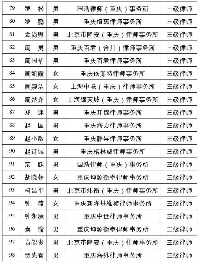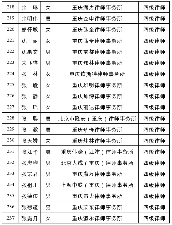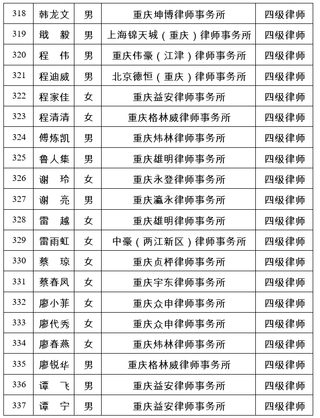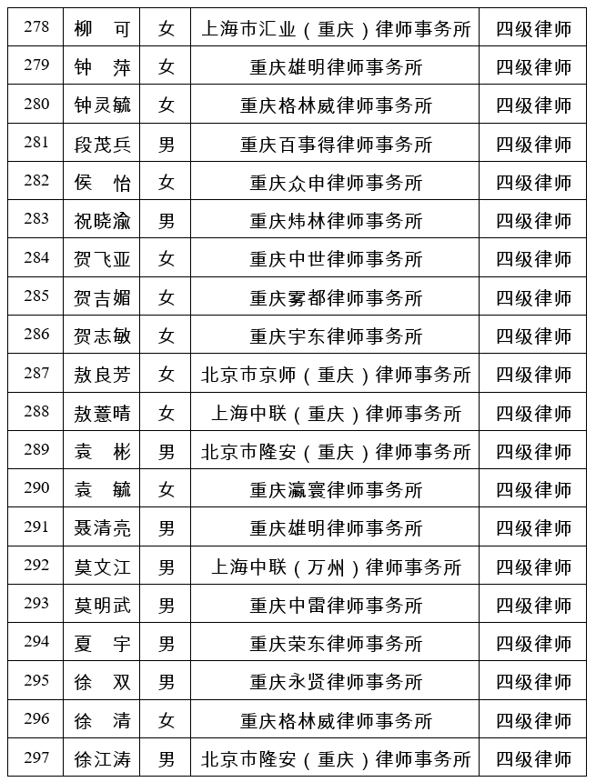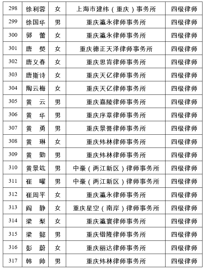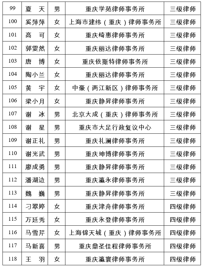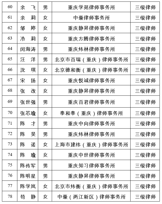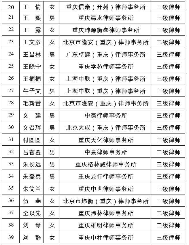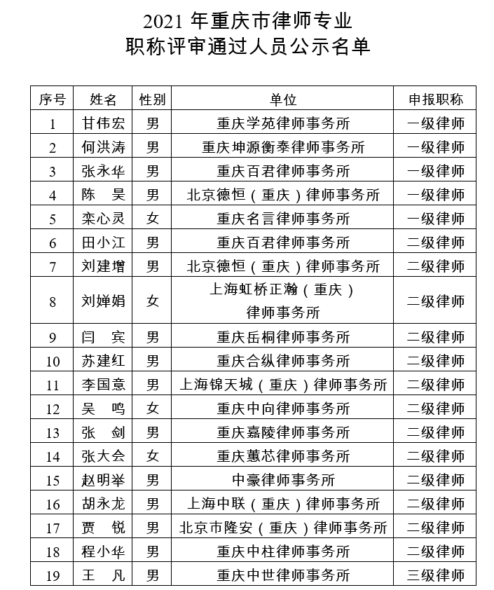 现将重庆市律师专业高级职称评审委员会2021年12月28日评审通过人员名单予以公示(附后)。