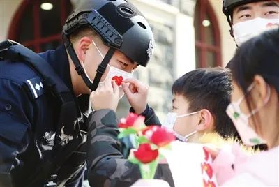 在“中国人民警察节”来临之际,市公安特警总队尖刀机动队的特警队员们在巡逻时收到一份特殊的礼物。红桥区文昌宫民族小学学生将手工制作的小红花和“110”主题画作送给特警,并为他们贴上红色爱心表达感谢。记者 孙震 潘立峰 摄