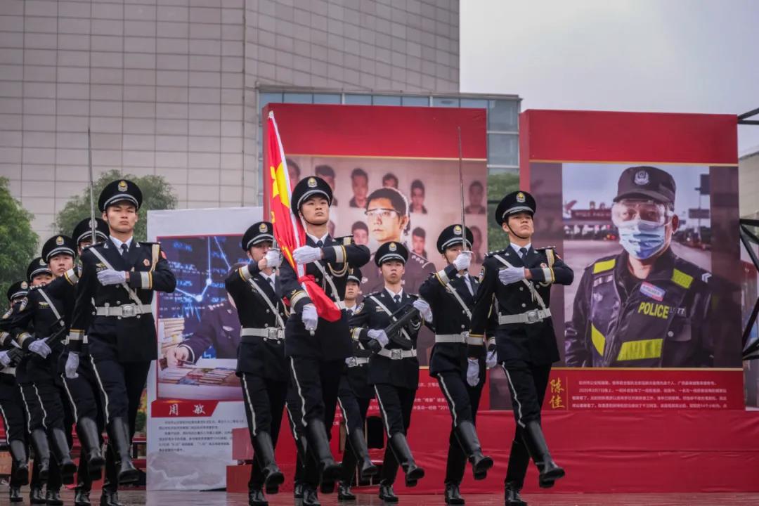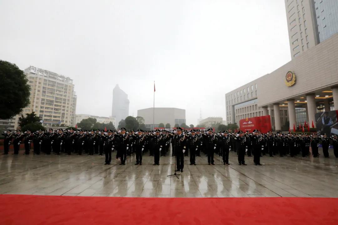 8时30分许,身着警礼服的仪仗队员迈着整齐的步伐,护卫中华人民共和国国旗入场,伴随着雄壮的中华人民共和国国歌,鲜艳的五星红旗冉冉升起,全体同志列队肃立,面向国旗致以崇高敬礼。随后,仪仗队员步履坚定,护卫中国人民警察警旗入场,在嘹亮的中国人民警察警歌声中,中国人民警察警旗徐徐升起,全体同志面向警旗庄严敬礼。警旗猎猎,誓言铮铮,在周成方同志的带领下,全体民警高举右拳宣誓,铿锵有力的公安机关人民警察誓词响彻全场。