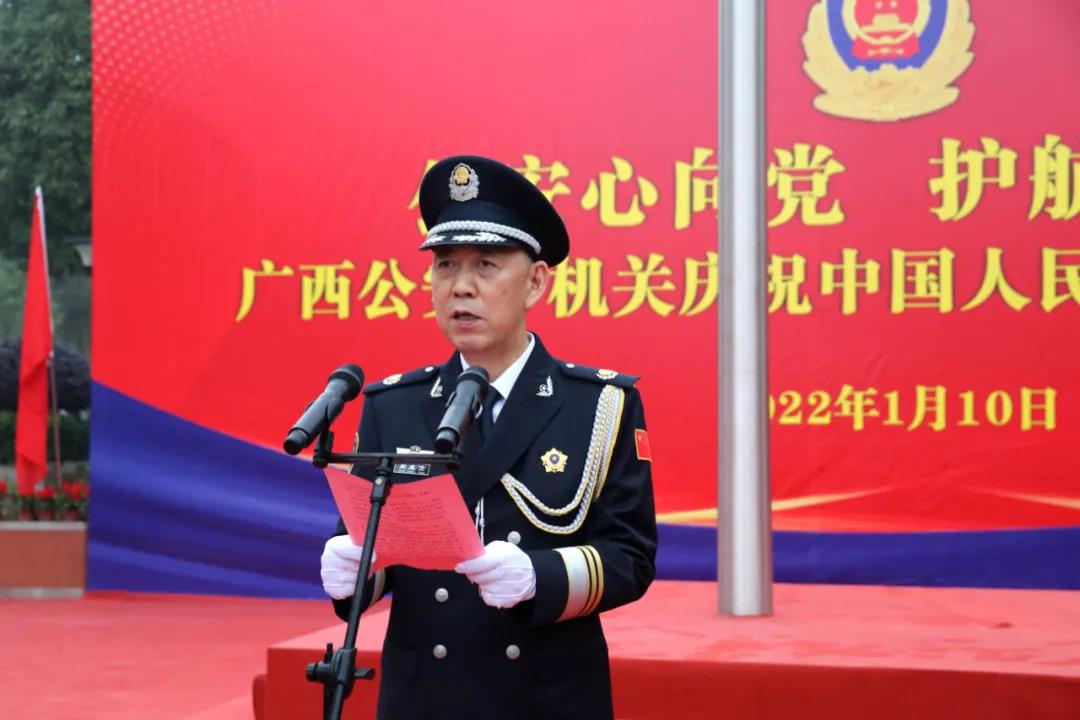 公安心向党、护航新征程。2022年是“两个一百年”奋斗目标历史交汇期的关键之年,是党的二十大召开之年,做好今年各项公安工作责任重大、使命光荣。全区公安机关要全面贯彻党的十九大、十九届历次全会精神,弘扬伟大建党精神,深刻领悟“两个确立”的决定性意义,切实增强“四个意识”、坚定“四个自信”、做到“两个维护”,牢牢把握对党忠诚、服务人民、执法公正、纪律严明总要求,踔厉奋发、笃行不怠,在巩固发展民族团结、社会稳定、边疆安宁上彰显新担当,为凝心聚力建设新时代中国特色社会主义壮美广西贡献公安力量,以优异成绩迎接党的二十大胜利召开!