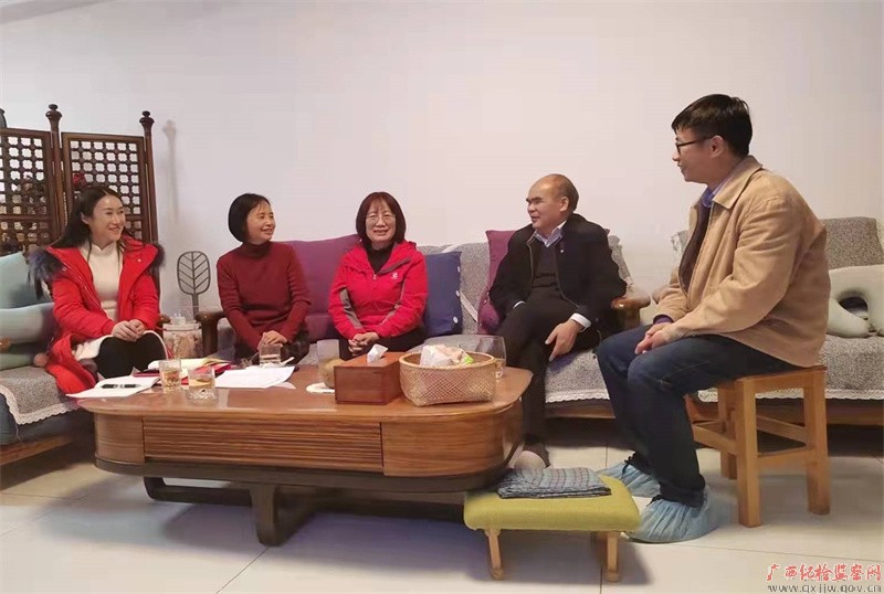 广西工商职业技术学院纪委书记韦云凤(左二)在该院党委书记覃武云(右二)家中进行廉政家访。