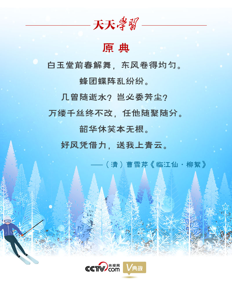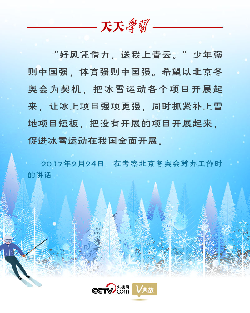 习近平总书记先后五次实地考察冬奥会筹办工作,强调要通过筹办北京冬奥会、冬残奥会,推动我国冰雪运动跨越式发展,补缺项、强弱项,推动新时代体育事业高质量发展。总书记多次引经据典勉励运动员、教练员、工作人员和志愿者等,《天天学习》特撷取其中经典语句,与您一起学习领悟。