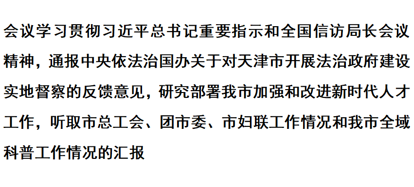 17日上午,市委常委会召开会议,学习贯彻习近平总书记在中央政治局第三十六次集体学习时的重要讲话精神,学习贯彻习近平总书记重要指示和全国信访局长会议精神,通报中央依法治国办关于对天津市开展法治政府建设实地督察的反馈意见,研究部署我市加强和改进新时代人才工作,听取市总工会、团市委、市妇联工作情况和我市全域科普工作情况的汇报。市委书记李鸿忠主持会议。